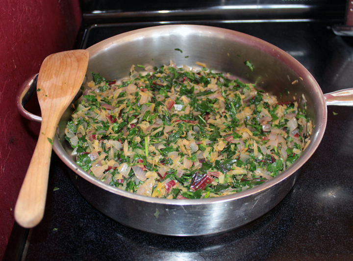 -Go nuts with your veggie combos. Add or take away whatever you like, what’s fresh and available from your local farmers, or just what’s sitting in your fridge. Substitute shallots and green onions for the red onion and garlic. Add some shredded carrots instead of some of the greens. Add other fresh herbs. Get crazy! You should generally end up with the cooked veggies representing about 1/3-1/2 of the final volume of the mix.