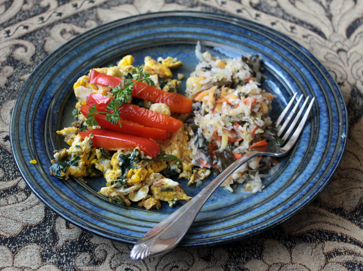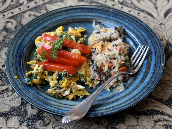 My super-healthy breakfast of eggs w/spinach, red peppers & cultured veggies, courtesy of my nurse-maid/husband.