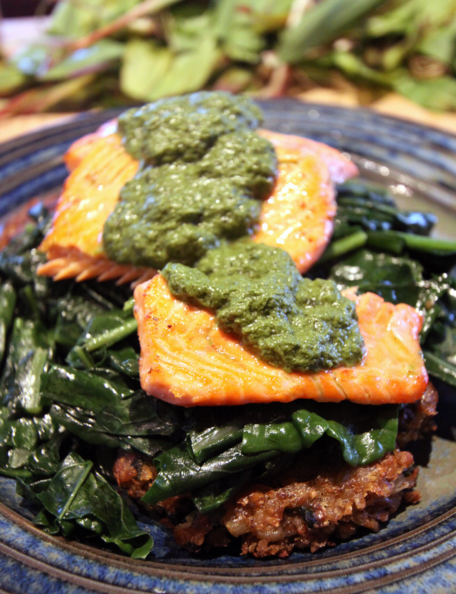 You can either serve these at room temperature or keep them warm in a low oven until ready to serve. They’re terrific as an appetizer just with the sauce; or make them a light dinner served on a bed of greens with the sauce as your dressing with an extra wedge of lemon; or go for it and serve them with sauteed kale & swiss chard, salmon and sorrel sauce (perhaps I’ll post that as an official recipe soon…). YUM!