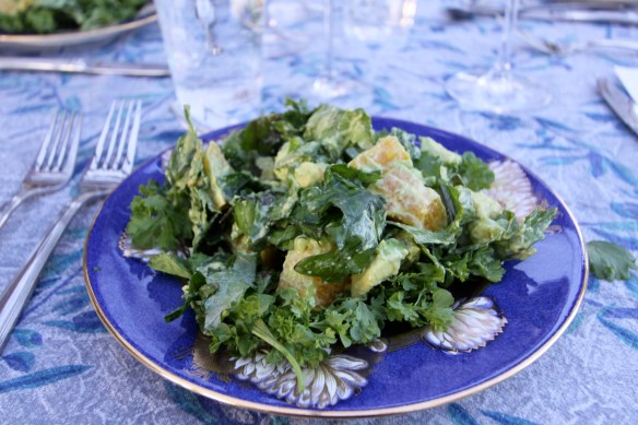 I know, I know.  We’re seeing raw kale salad recipes all over the place.  But if you haven’t tried one, do it.  Seriously.  Did I ever mention that I was originally thinking of naming this blog Cavorting Kale?  Yup, that’s how much I love kale.  But it turns out I’m not the only one.  This salad was a big hit at our annual Summer Solstice Wine Pairing Dinner (course 3 of 7)…
