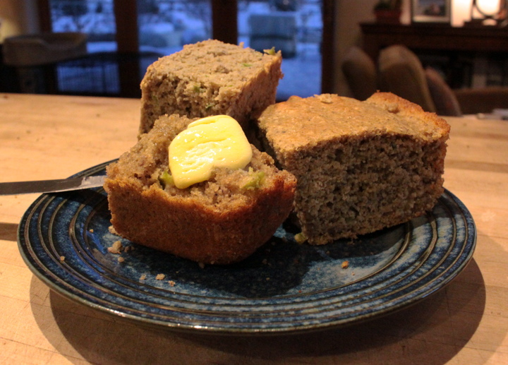 In order to survive our months on the Body Ecology regime, occasional gluten and sugar free baked goods were like a life preserver. Or perhaps more like a nice warm, snuggly blanky. I feel pretty good about the healthful qualities of this recipe since I soak the flours (why?) and use not just one, but two, veggies in it. Totally legit, right? Those of you not doing some sort of crazy diet might be tempted to skip to the next page at my mention of gluten & sugar free. That would be a mistake, my friends. Oh yes.